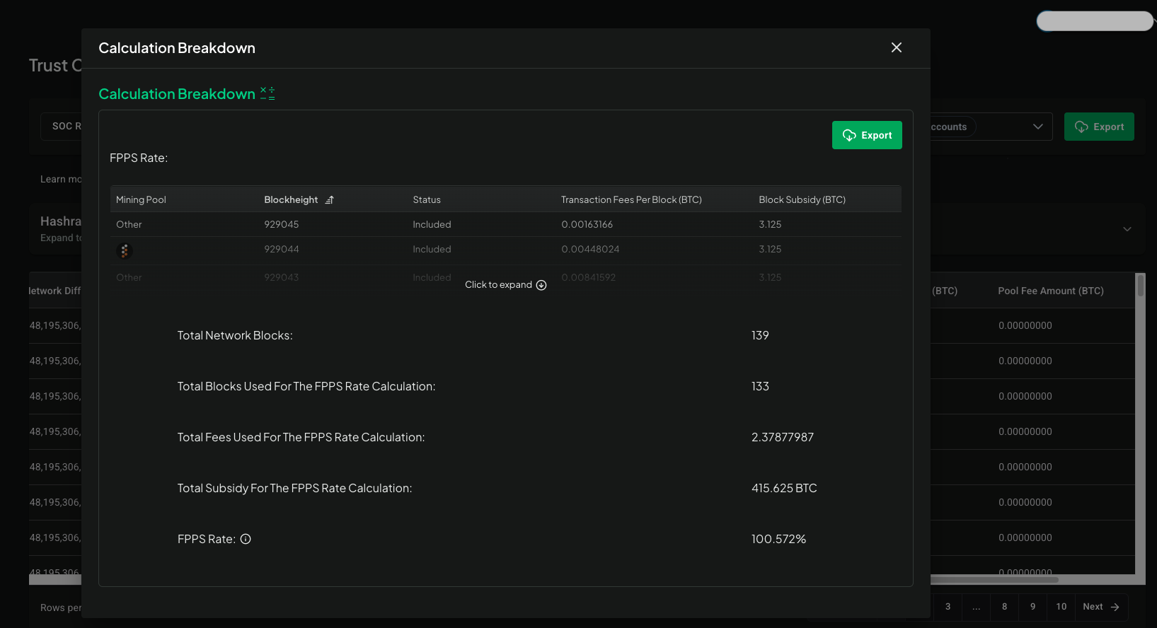 - There's a collapsed table in this dialog, which when expanded, displays details on each block mined during the selected date, including: Mining Pool, Block Height, Status (whether block was included or excluded in FPPS rate calculation), Transaction Fees Per Block, and Block Subsidy.