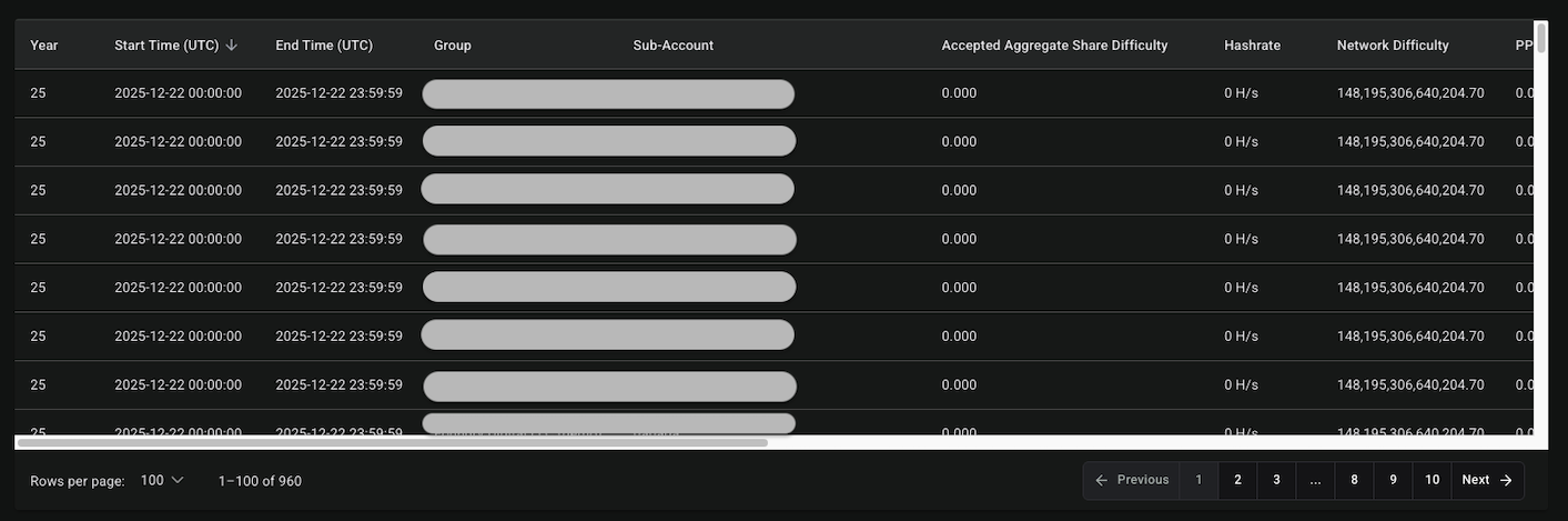 - The main Audit Report table contains daily statistics for the following Sub-Account data items: Year, Start Time (UTC), End Time (UTC), Group, Sub-Account, Accepted Aggregate Share Difficulty, Hashrate, Network Difficulty, PPS Base Amount, Total Network Blocks, Total Blocks Used, FPPS Rate (%), Gross Earnings, Pool Fee Amount, and Net Total Amount