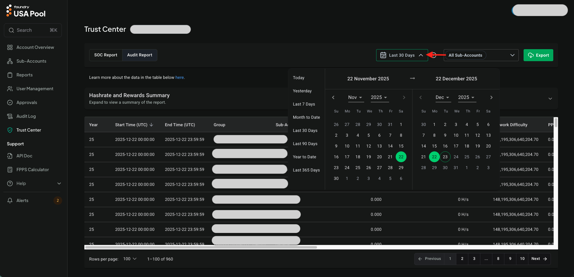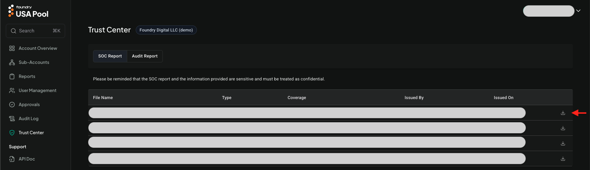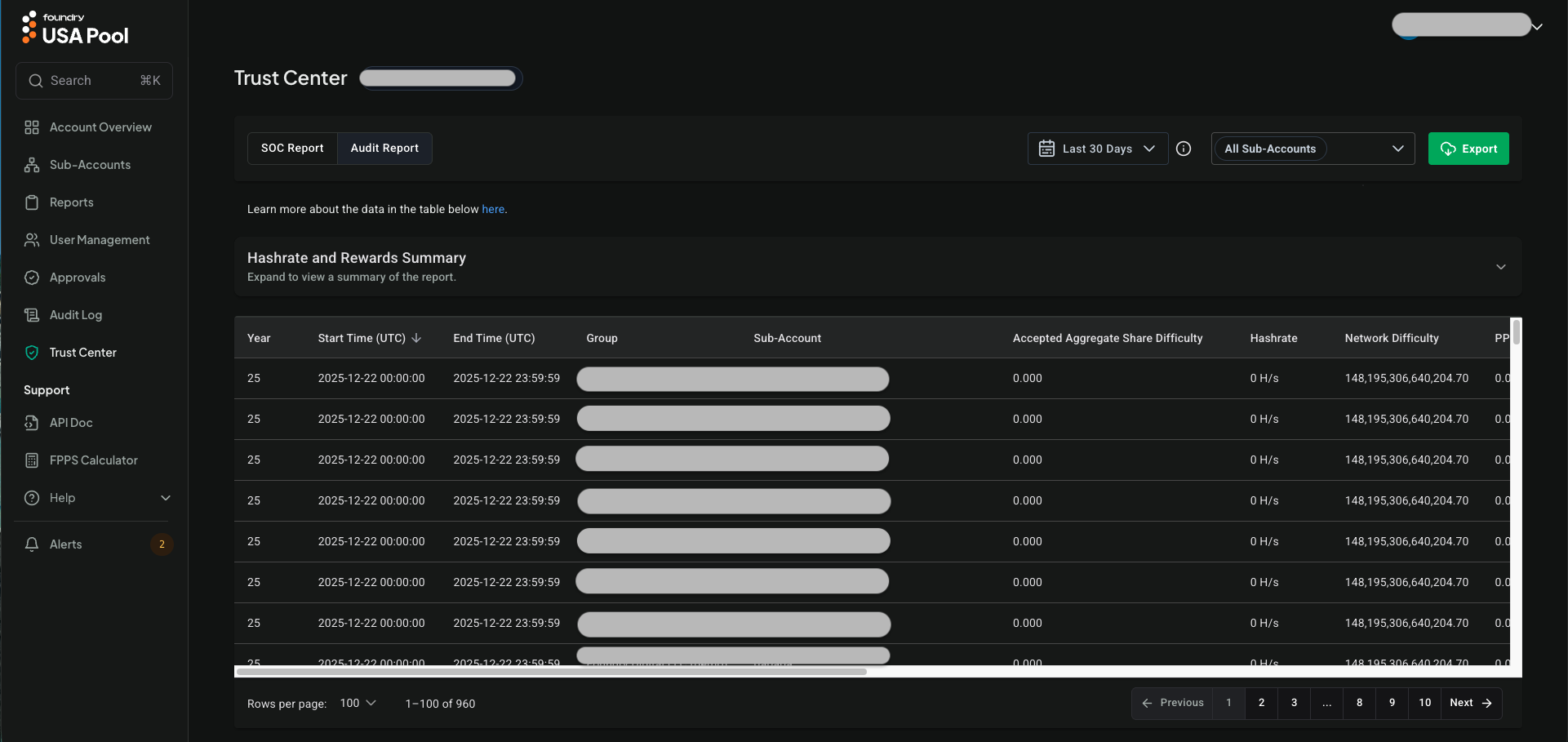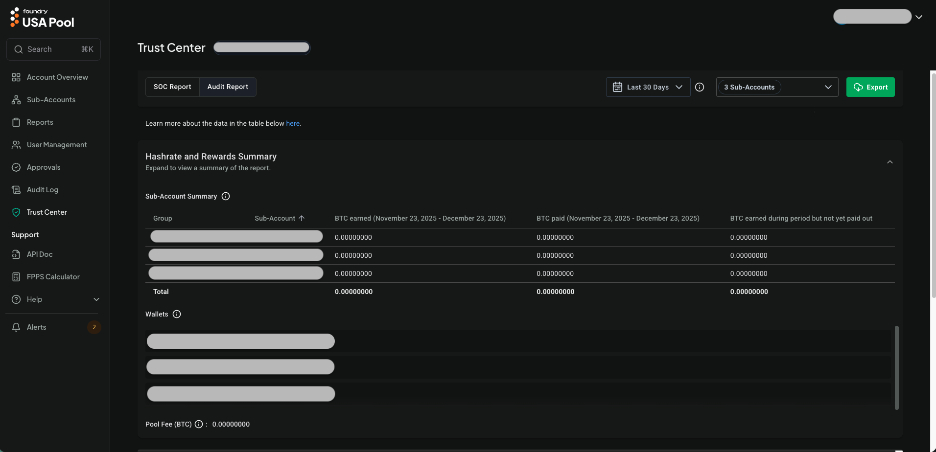 The Trust Center is a feature that allows you to download SOC reports and view the Audit Report which provides financial and hashrate details for multiple sub-accounts