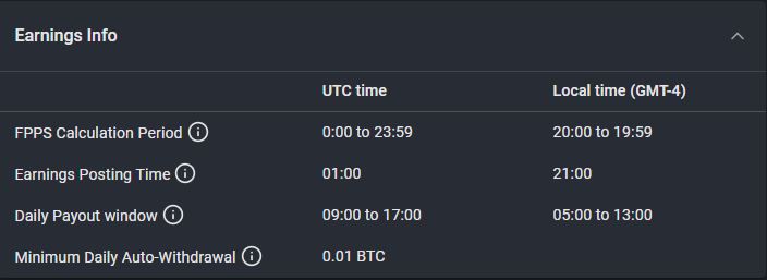 The Foundry USA Pool's daily payout window for earned BTC is between 9:00-17:00 UTC time.